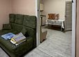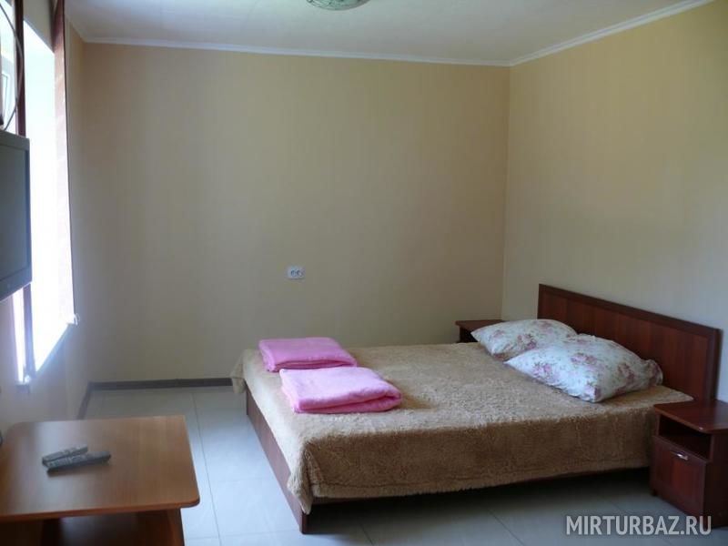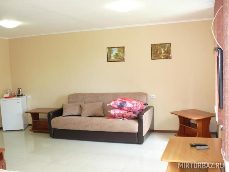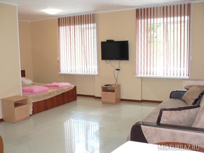 1 двуспальная кровать, 1 двуспальный диван, ТВ, чайник, К, тумбы, вешалки, Х, с/у в номере