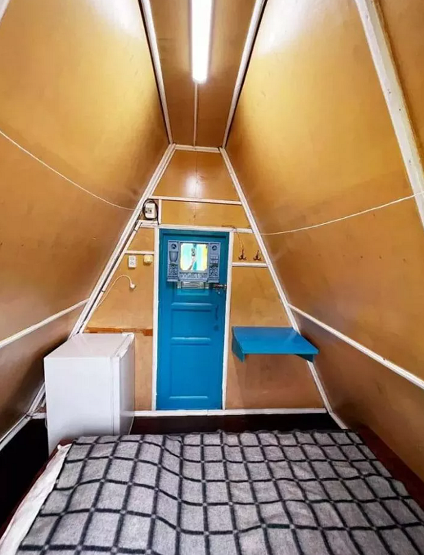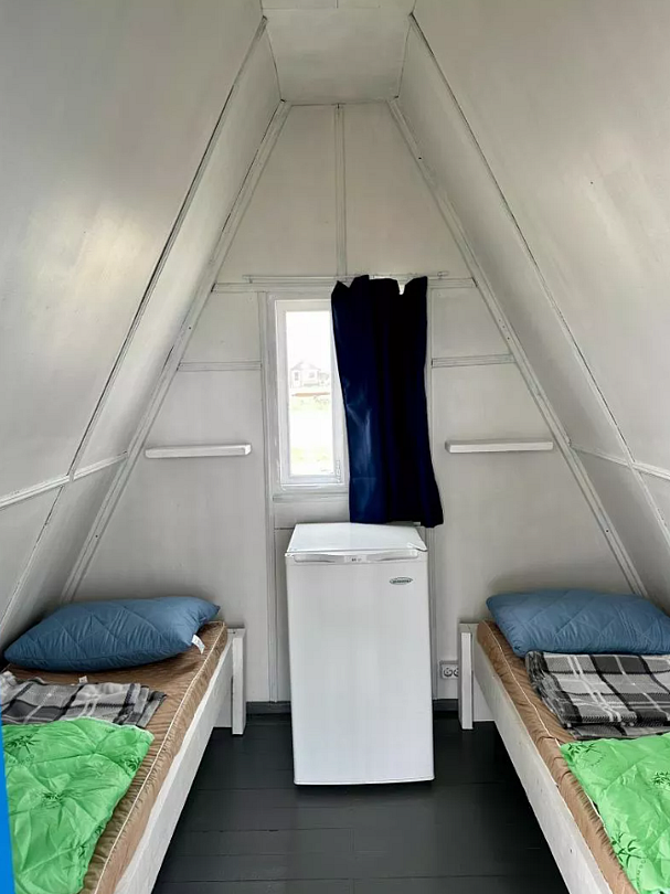 - 1-й домик — двуспальная кровать, холодильник, матрасы, одеяла, подушки, свет и розетка;