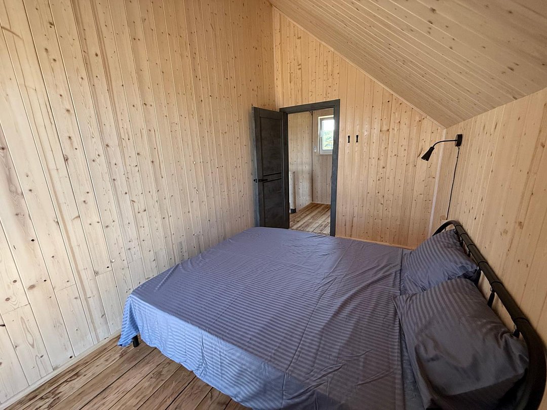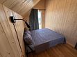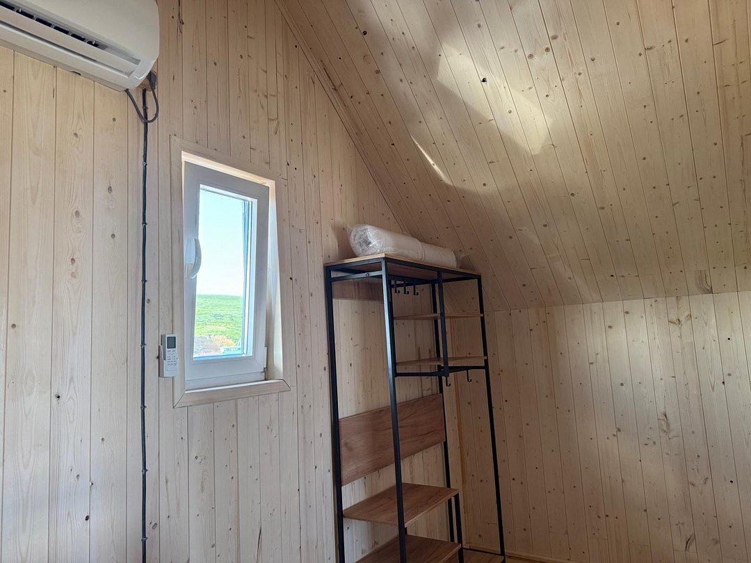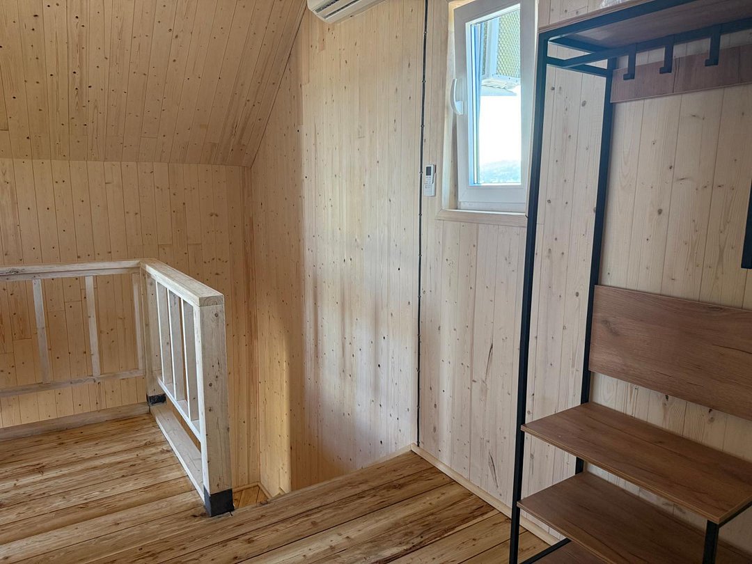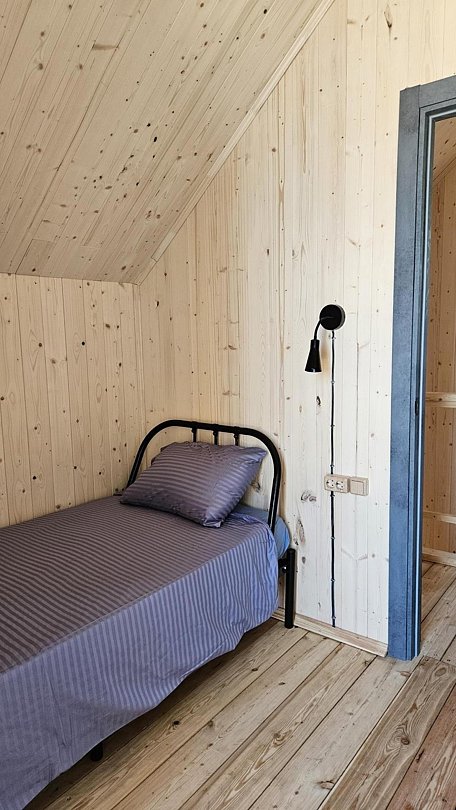 Каждый домик — это отдельный номер с собственной террасой. На первом этаже находятся кухня-гостиная с обеденной зоной, раскладной диван, санузел с душем и выход на открытую веранду. На втором уровне — спальная зона, 2 комнаты, спальня с двуспальной кроватью и спальня с односпальной кроватью.