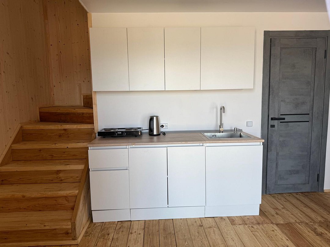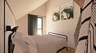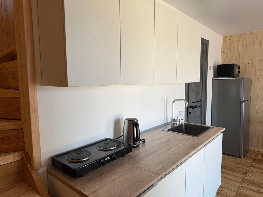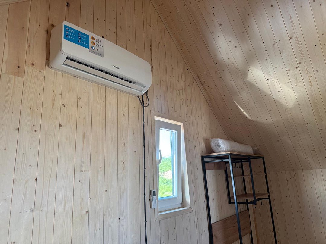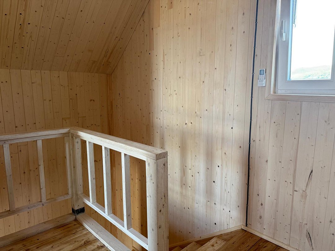 Каждый домик — это отдельный номер с собственной террасой. На первом этаже находятся кухня-гостиная с обеденной зоной, раскладной диван, санузел с душем и выход на открытую веранду. На втором уровне — спальная зона, 2 комнаты, спальня с двуспальной кроватью и спальня с односпальной кроватью.
