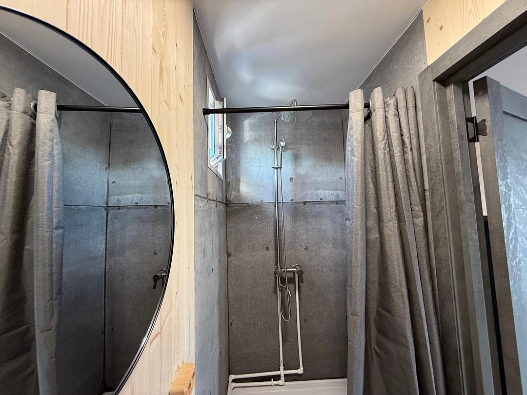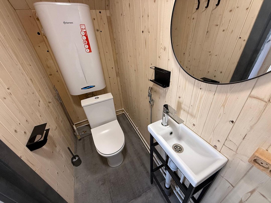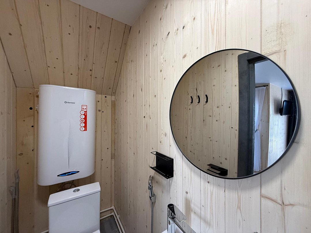 Санузел оснащён душевой кабиной, бойлером, феном. Вечером на фасаде включается мягкое освещение — уютно и удобно, если вы вернётесь поздно.