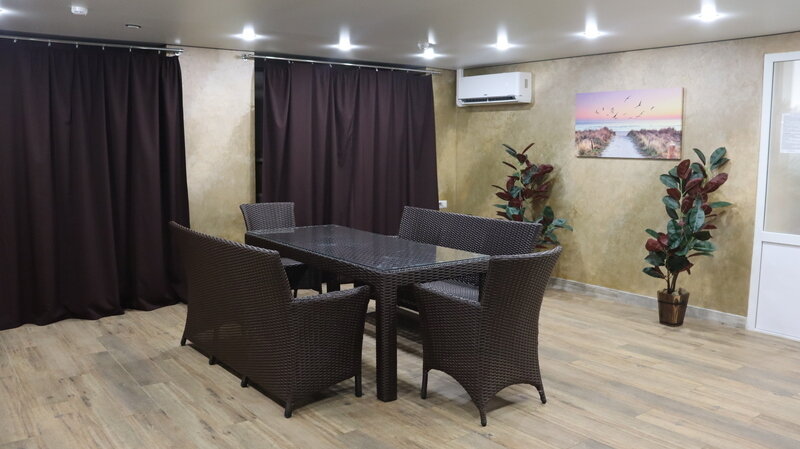 Посетители могут арендовать уютный двухэтажный коттедж, а также благоустроенные номера в основном корпусе базы отдыха. На территории комплекса находится русская баня на дровах, сауна, бассейн, площадка для барбекю, русский бильярд. При желании можно организовать морскую прогулку. Для морских прогулок клиентам предлагается морское снаряжение, катер, водный мотоцикл.