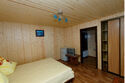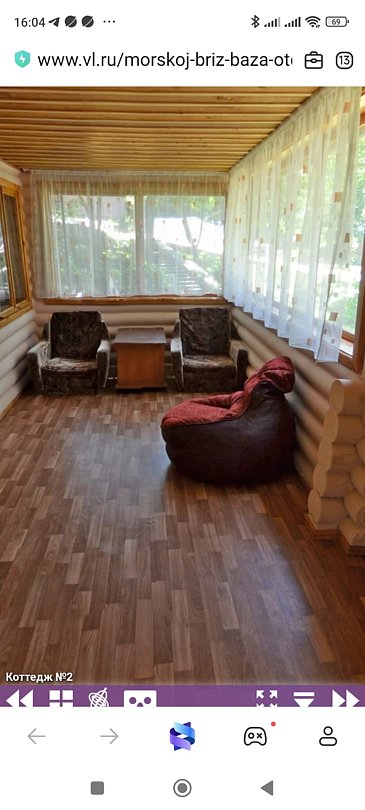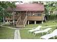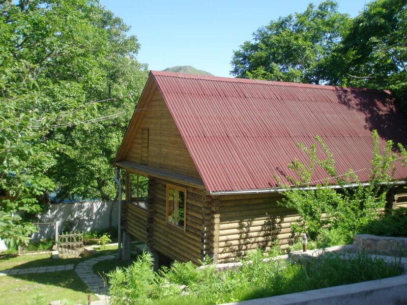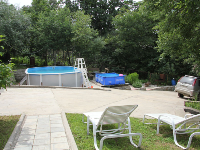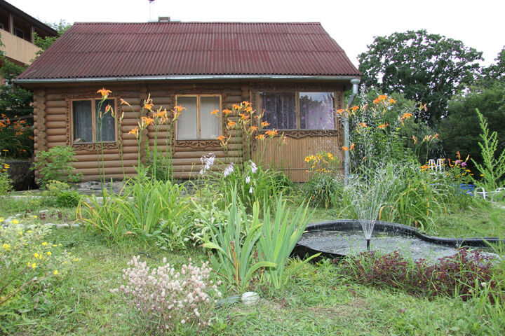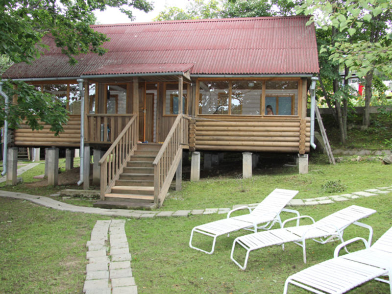 Домик из круглого бревна, рассчитан на пребывание большой семьи или двух пар, с двумя двух-трех местными спальными комнатами, выходящими на общую остекленную веранду, используемую как гостевую.