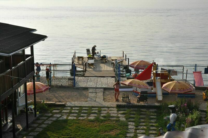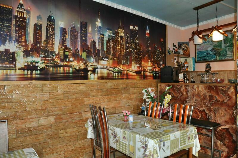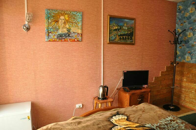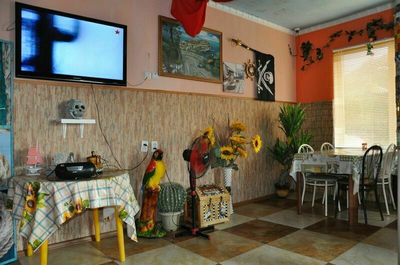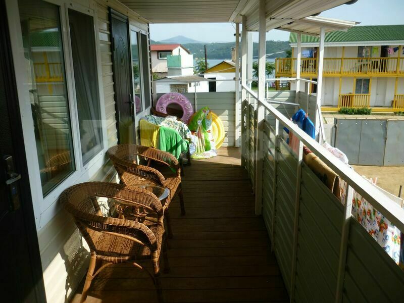 В номере: диван и 2 односпальные кровати,прикроватные тумбочки, телевизор, шкаф, холодильник, TV тюнер, стол, стулья. На террасах прилегающих к каждому номеру имеются столики со стульями. Санузел в каждом номере . Холодная и горячая вода в каждом номере (бойлер).