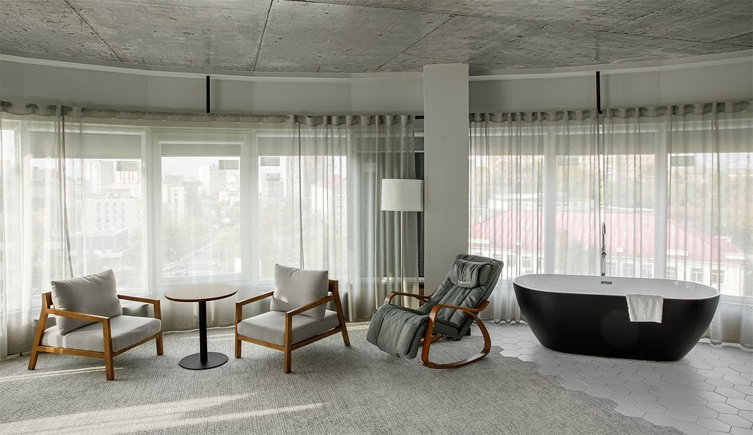 Представительский номер, полукруглой формы с панорамными окнами и прекрасным видом на город. Идеально, как для работы, так и для отдыха. Номер с рабочей зоной, журнальным столом, двухспальной кроватью, удобным раскладывающимся диваном и креслом с функцией массажа. В вашем распоряжении просторная ванная комната, оснащенная душевой кабиной и ванной, косметическим зеркалом, дополнительными туалетно-косметическими принадлежностями, феном и весами. Станция для приготовления чая и кофе-машина «Nespresso».Услуги и удобства