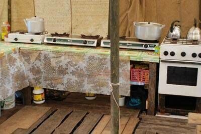 - Двухместные палатки, стоящие на деревянных настилах и укрытые от дождя специальными тентами.
