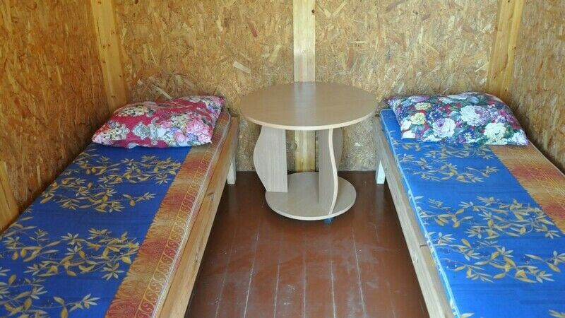 В каждом домике: две односпальные кровати, стол и вешалка. Перед домом оборудован навес и стол с лавочкой.