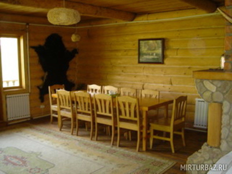 Трапезная представляет собой 2-этажный бревенчатый дом. Дом находится ориентировочно в 100 метрах от береговой полосы бухты и является многофункциональным. На первом этаже располагается просторное помещение с двумя каминами, которое может быть использовано как обеденный или банкетный зал, гостиная- зал для просмотра ТВ, караоке-бар. В обычном режиме это уютное пространство используется как трапезная для гостей. Если у кого-то из гостей день рождения, юбилей или другая знаменательная дата, то по отдельному заказу может быть организован банкет. В любое время, кроме ночного, любой гость может воспользоваться гостиной для просмотра около 50 каналов спутникового ТВ. Использование гостиной в качестве караоке-бара возможно по предварительному согласованию с учетом интересов других гостей. Также на первом этаже располагается туалет для гостей, а также ряд подсобных помещений.