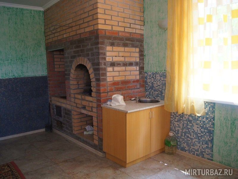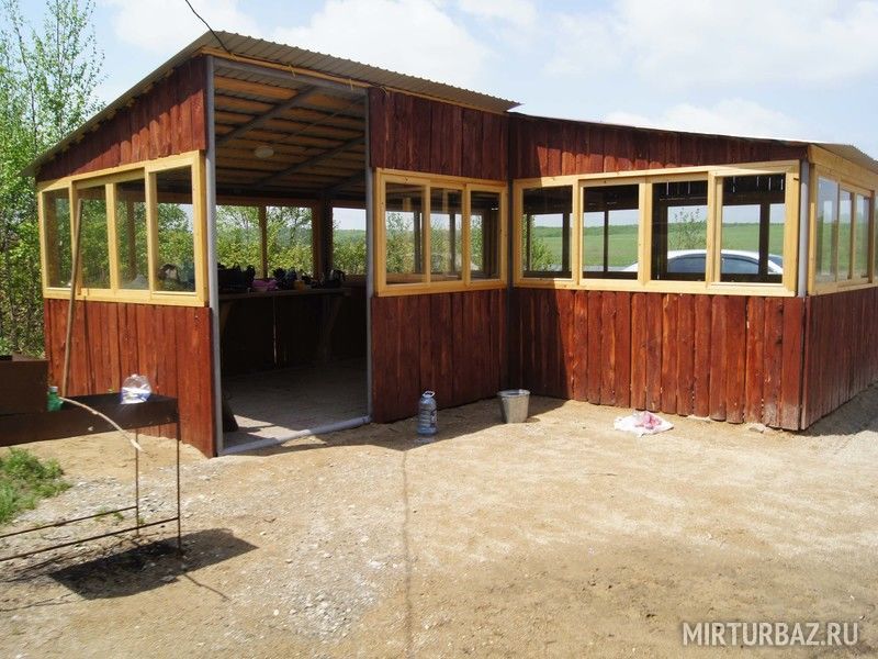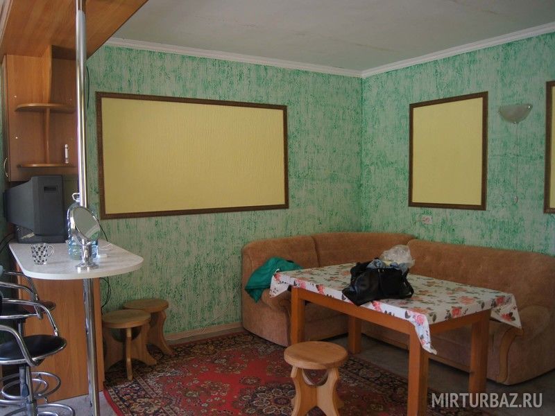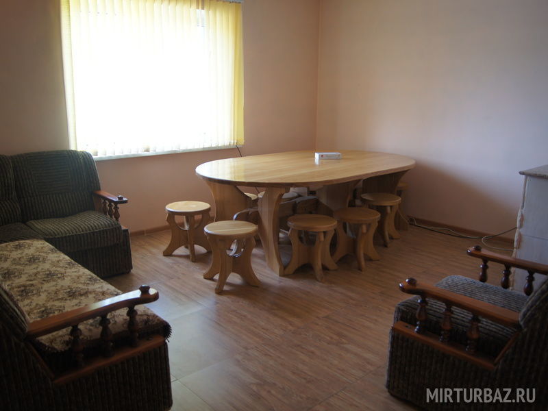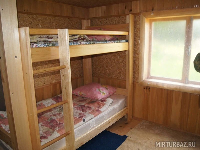 Домик разделен на гостиную и спальную комнату. В гостиной имеется двуспальный диван, стол, камин. В спальной комнате расположено шесть односпальных кроватей. Удобства находятся на улице (летний душ, туалет деревенского типа).