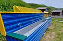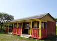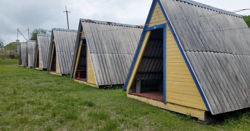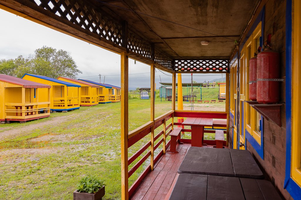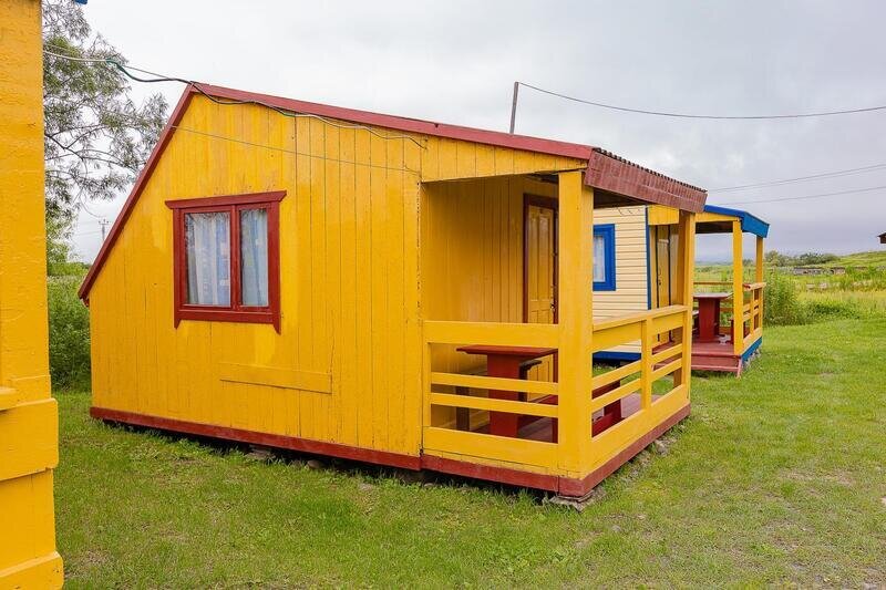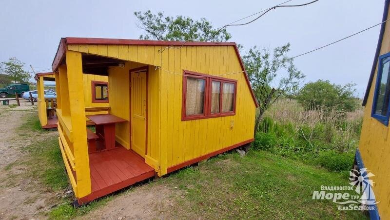 Выполнены из сэндвич панелей, расположены в середине базы вблизи коттеджей, волейбольной площадки и мангальной зоны. В домике: односпальная и двуспальная кровати, холодильник, зеркало, столик, вешалка для одежды, розетки. На большом крыльце перед домиком есть столик, скамейка, тумба.