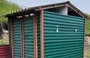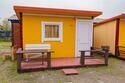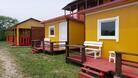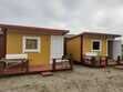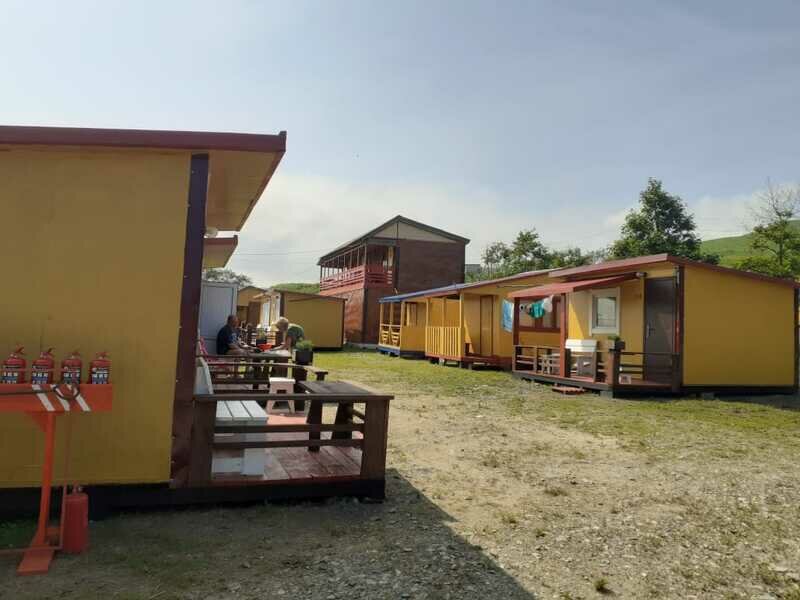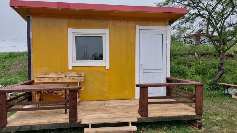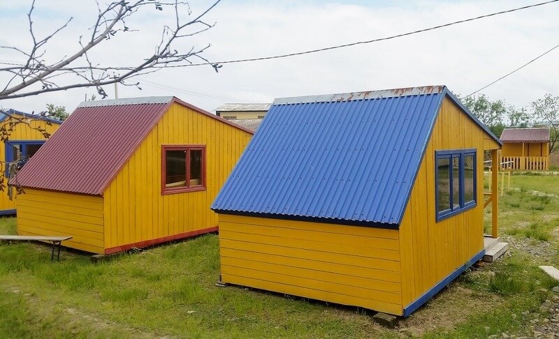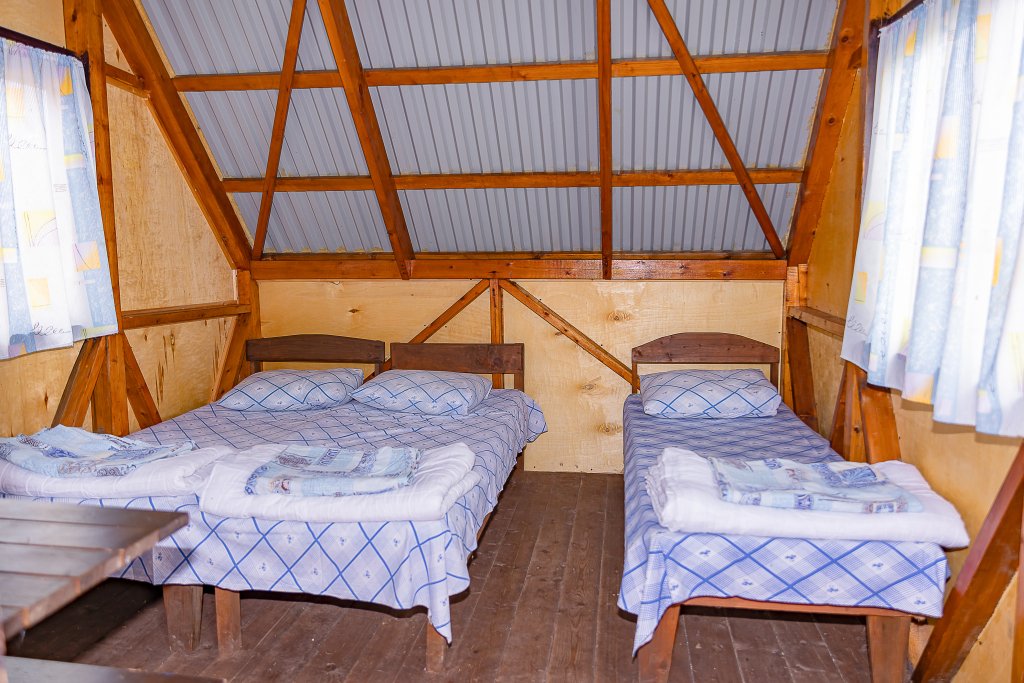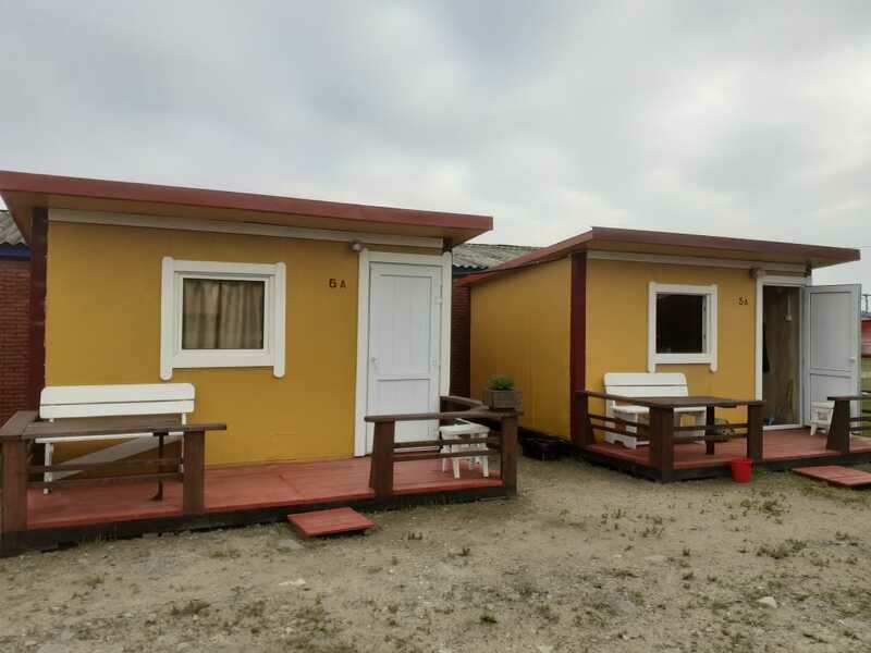 Выполнены из сэндвич панелей, расположены в середине базы вблизи коттеджей, волейбольной площадки и мангальной зоны. В домике: односпальная и двуспальная кровати, холодильник, зеркало, столик, вешалка для одежды, розетки. На большом крыльце перед домиком есть столик, скамейка, тумба
