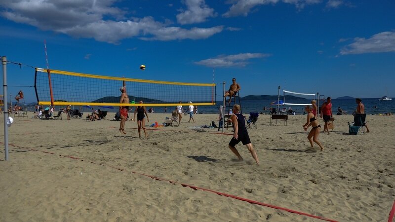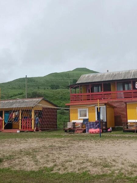 Коттеджи располагаются напротив волейбольной площадки, в центре турбазы. А из окон комнат на втором этаже открывается живописный вид на море.