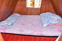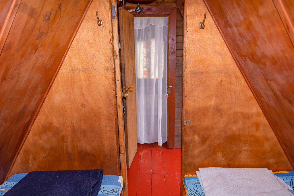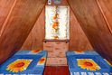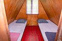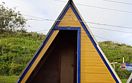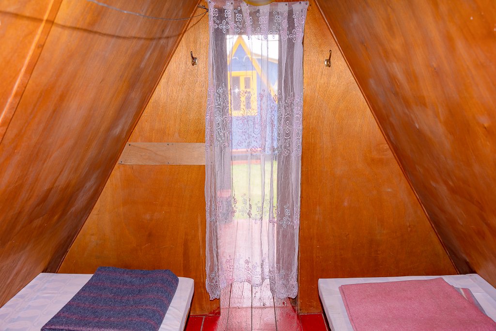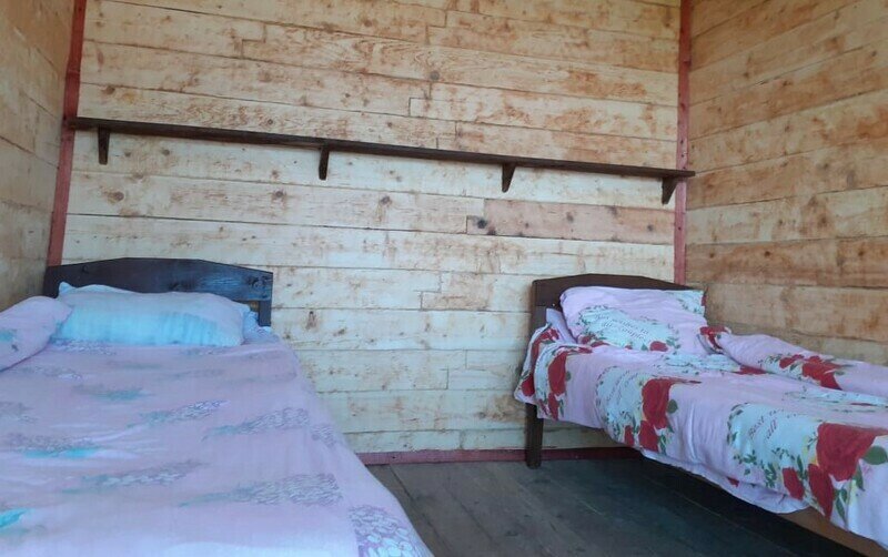 Небольшой деревянный домик по типу вигвама с верандой. Располагается напротив душевых и туалета. В домике две односпальные кровати. Отлично подойдет для одиночной поездки, проживания с другом или партнером.