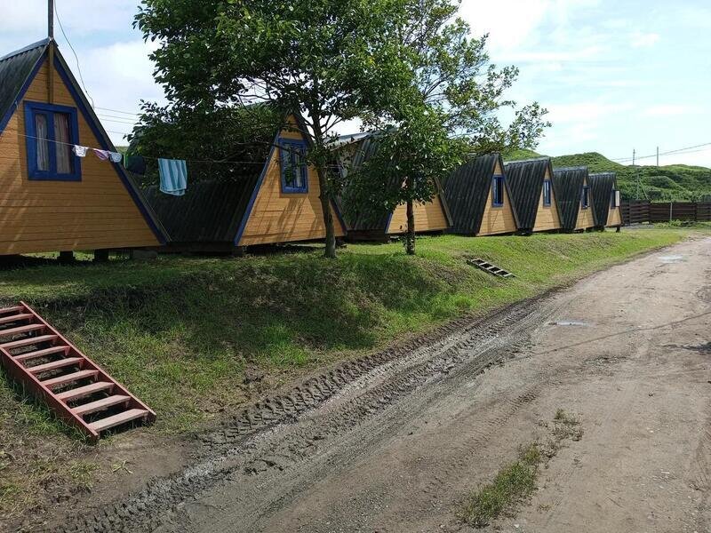 Коттеджи располагаются напротив волейбольной площадки, в центре турбазы. А из окон комнат на втором этаже открывается живописный вид на море. Комнаты укомплектованы холодильником, столом, лавочками или табуретками, розеткой, тремя местами для сна.
