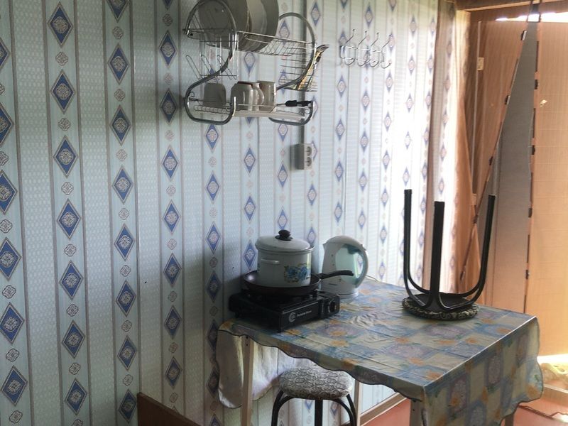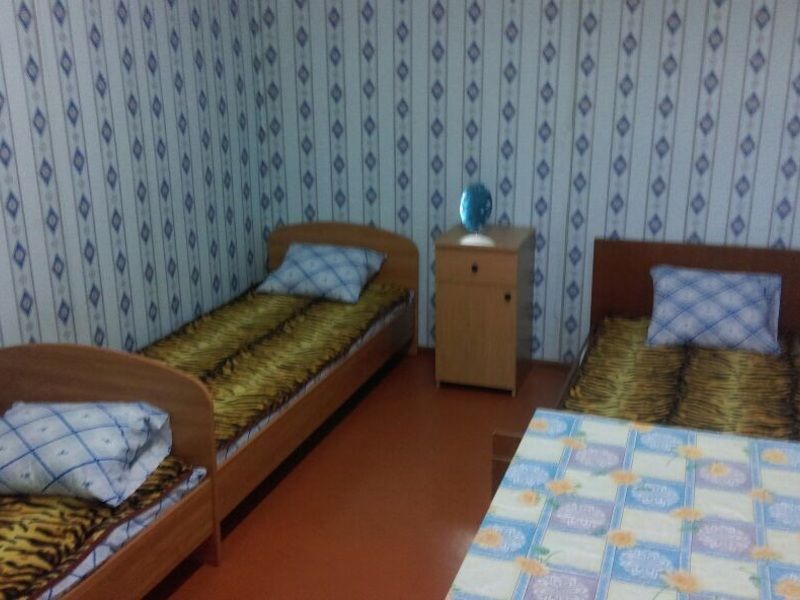 В номерах: бельё, посуда, стол, стулья, тумбочка, электрочайник, холодильник, газовая плита, ведро, веник\совок, зеркало.