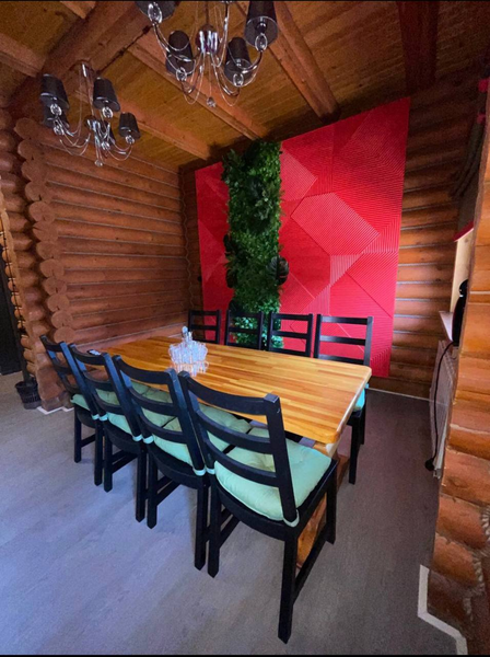 Приятный интерьер в стиле рустик с элементами лофта. Место для сцены и профессиональное музыкальное оборудование, как для фоновой музыки, так и для работы диджея. Цветомузыка над сценой. Зона бара, небольшая лаунж зона, и две небольшие кабинки, если вы хотите уединиться.