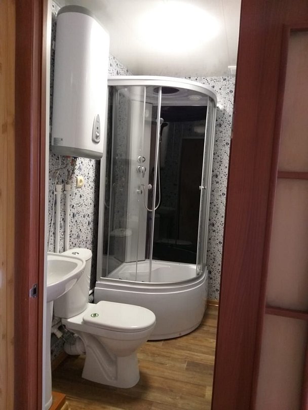 - одна двуспальная кровать, одна двухъярусная кровать, комод, тумбочка, холодильник, душевая кабинка, санузел, бойлер на 50 литров, раковина, стол, стулья.