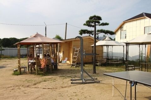 Все домики оборудованы пластиковым стеклопакетом с притонированными стёклами, столом в обеденной зоне, 4 стульями. Во всех номерах большой холодильник, плитка, чайник, набор посуды на 4 персоны, кастрюля, сковорода.