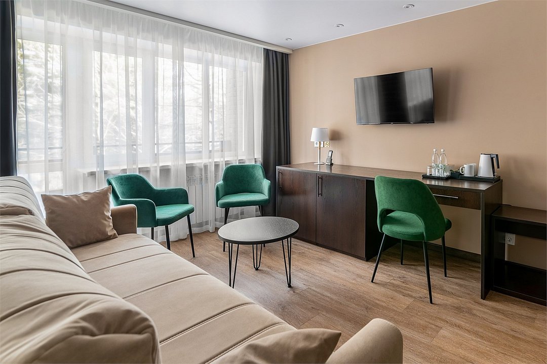 два телевизора, кабельное телевидение, Wi-Fi, кондиционер, светильник, фен, электронные замки, ванная комната, душевая кабина, санузел, халаты, банные полотенца, тапочки, косметические средства, двуспальная кровать, две односпальные кровати, диван, шкаф для одежды, гардеробная, письменный стол, зеркало, две комнаты, мини-бар, письменные принадлежности, чайный набор, информационная карта, меню, сейф, чайник, унитаз, раковина, ковровое покрытие, душ, кулер на этаже, стул, стол, туалетные средства, туалет, вид на парк, диван-кровать, раскладной диван, внутренний телефон, телевизор с плоским экраном, мини-холодильник, шкаф-купе, гостиничная парфюмерия, номер для некурящих, вид на лес, пуфик, рабочий столВ гостиничном номере