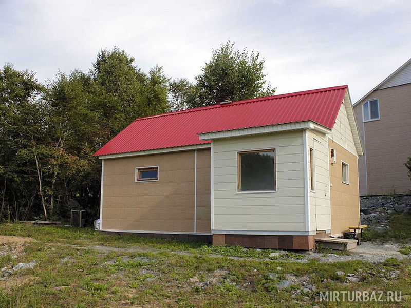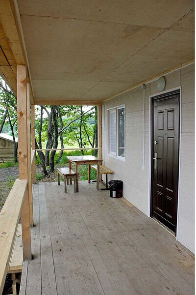 В домике: одна комната и туалет с умывальником, душ (горячая, холодная вода). В комнате: двуспальная кровать (евростандарт), электрический чайник, мини-холодильник, телевизор. Возможен вариант с двухярусной кроватью или двуспальным диваном. Около домика свой маленький дворик, огороженная площадка под навесом, уличный стол, лавочка, 2 табурета.