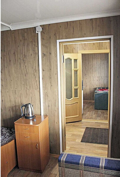 В домике: одна комната и туалет с умывальником (холодная вода). В комнате: две односпальных кровати (евростандарт), малогабаритный раскладной диван, электрический чайник, холодильник, телевизор (2 - 4 программы). Около домика свой маленький дворик, огороженная площадка под навесом, уличный стол, лавочка, 2 табурета.