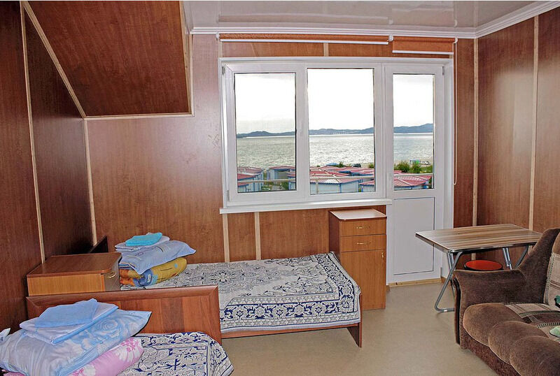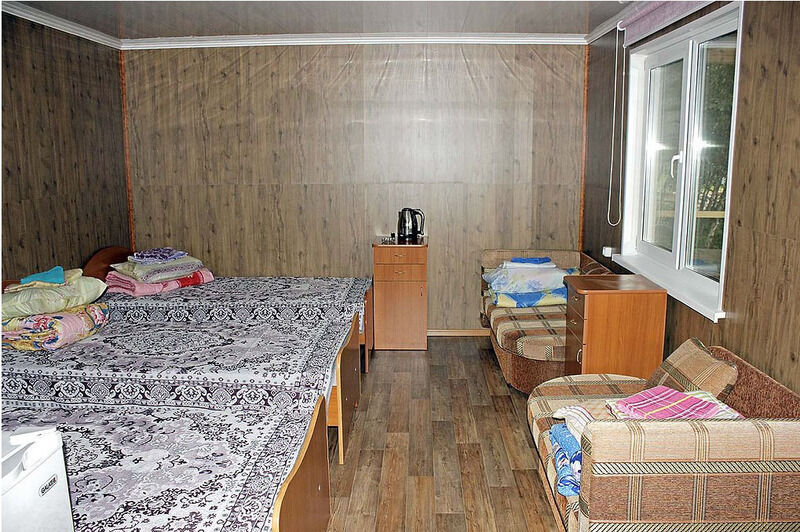 В домике: две комнаты и санузел (туалет, душ, умывальник, горячая и холодная вода). В первой комнате: две полутораспальные кровати, тахта, тумбочка, телевизор. Во второй комнате: две полутораспальные кровати, тахта, тумбочка, холодильник, чайник. Каждый домик имеет веранду, обеденный стол и две лавочки.