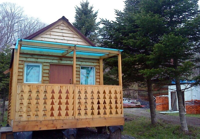 2 кровати, тумба для одежды, стол стулья, комплект посуды и белья. Душевые (горячая вода) и туалеты оборудованы на территории.