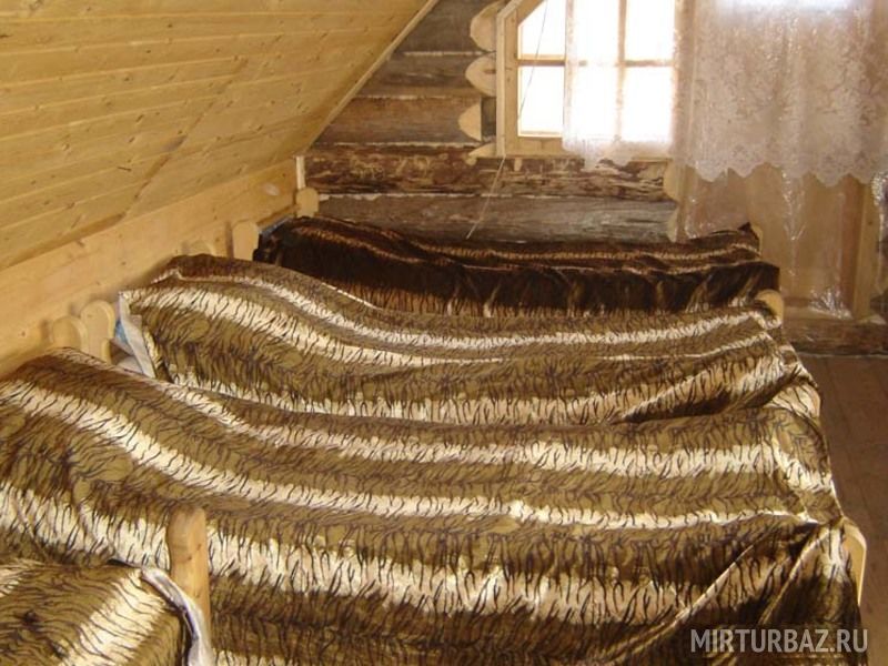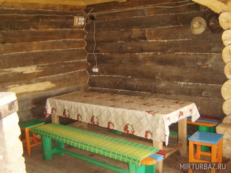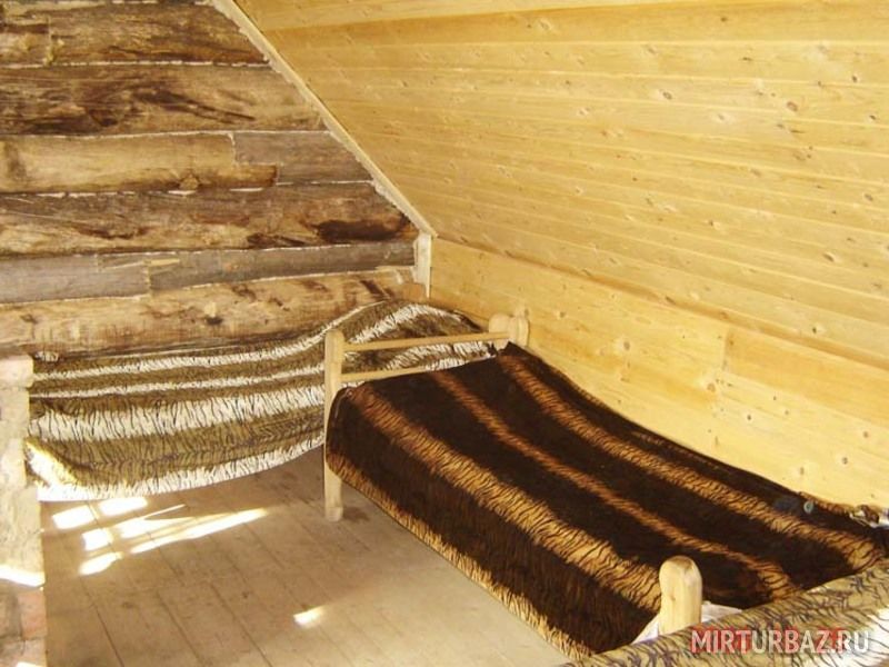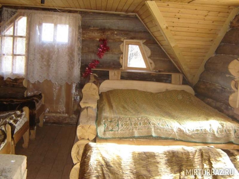 Представляет собой двухъярусную комнату с тамбуром. Внутри отделан вагонкой. В доме русская печь, умывальник, бачок с водой, стол и скамейка, электрочайник. На первом ярусе – 2 односпальные кровати, на втором ярусе – надувная кровать на 3 человека.