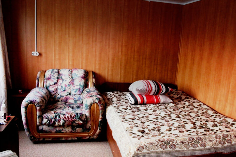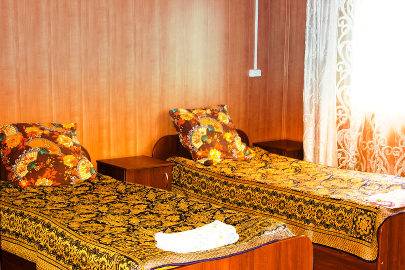 В номере есть две односпальные кровати, стол, стулья, шкаф, тумбочки. Душ, умывальник, туалет — на этаже.