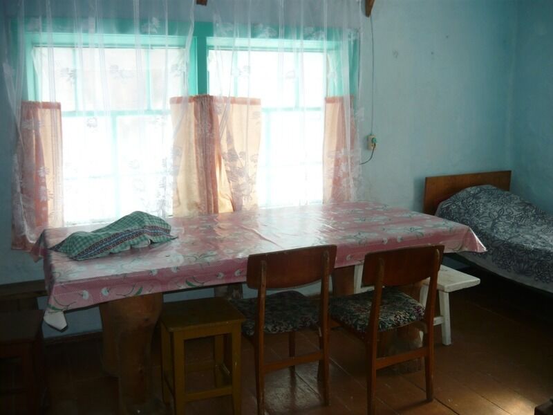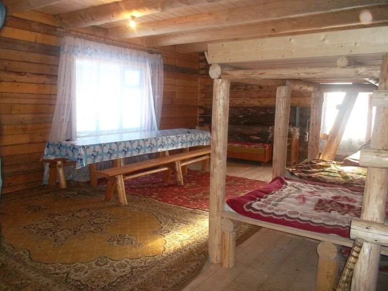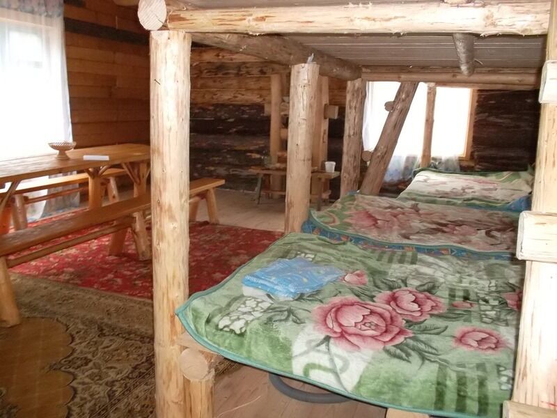 - Гостиная - стол, стулья, большая русская печь; спальные места - двуспальная двухъярусная кровать, односпальные кровати