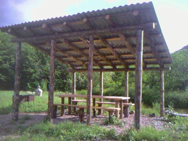 Навес с большим столом и мангалом для приготовления шашлыка.