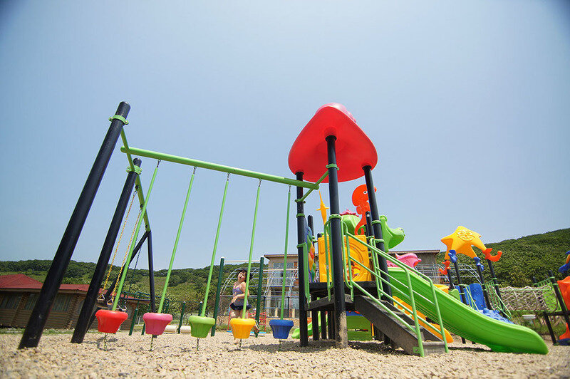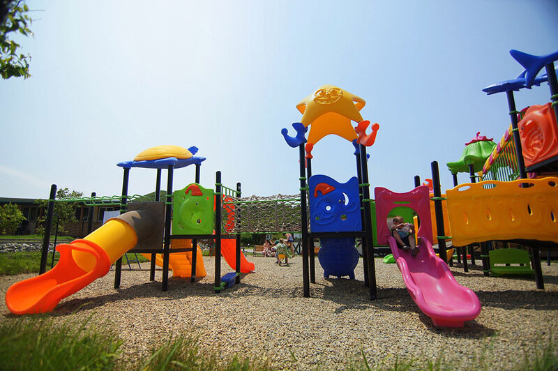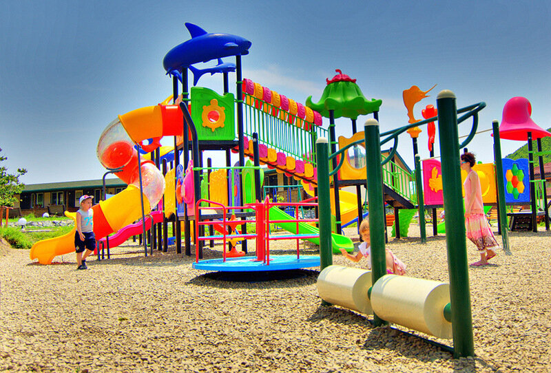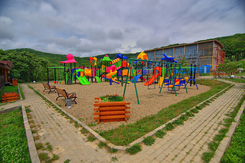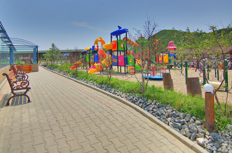 Детская площадка подойдет для отдыха детей от 2 до 10 лет. В нее входят горки, лабиринт, карусели, качели. Все аттракционы спроектированы для безопасного детского досуга. По периметру установлены удобные лавочки для родителей. Площадку полностью видно из любого места в кафе и бассейне.