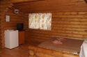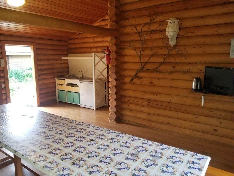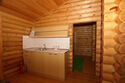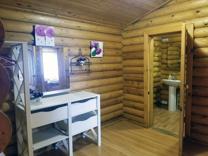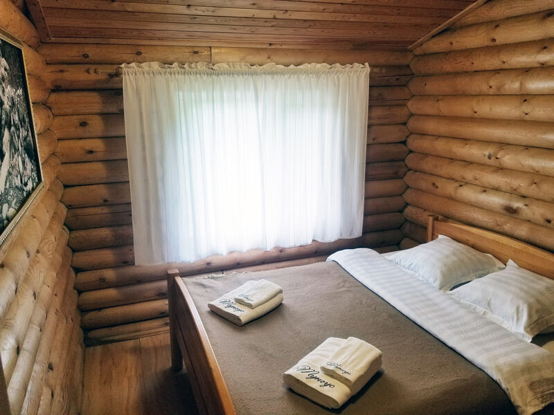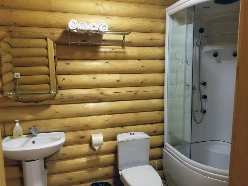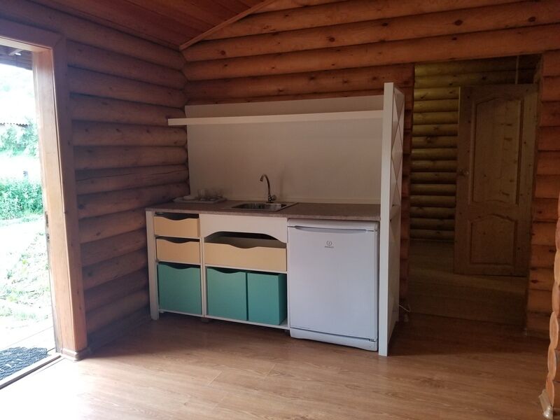 В домике нет кухни, но есть стол и уголок для приготовления закусок. Одна спальня с двуспальной кроватью 160х200 см, мягкий раскладной уголок, который подходит для размещения детей, стол со стульями, санузел с душевой кабиной и бойлером. В домике есть телевизор, диагональю 61 см и холодильник, по запросу предоставляется обогреватель. Имеется открытая веранда со столом и стульями.