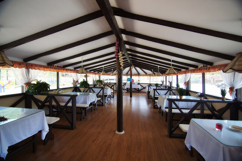 Крытое кафе на 32 места предлагает блюда европейской и национальной восточной кухни (плов, шурпа, каре ягненка). Большие дубовые столы и окна по всему периметру кафе создают уютную атмосферу. Обзор детской площадки позволяет наблюдать за детьми во время трапезы. В меню найдутся блюда и для детей, и для людей, следящих за своим весом.