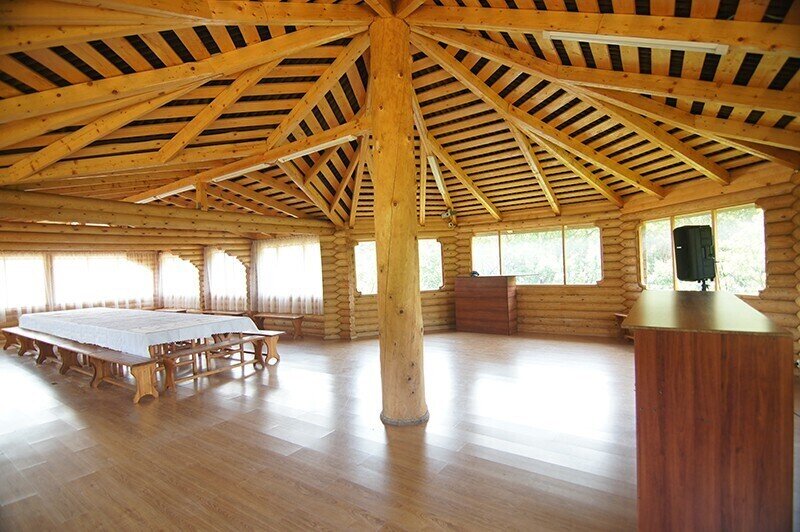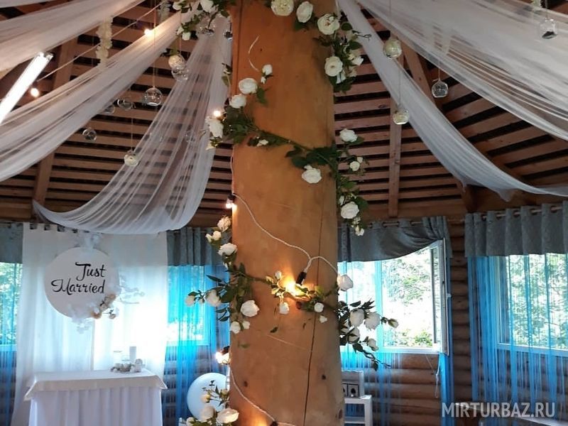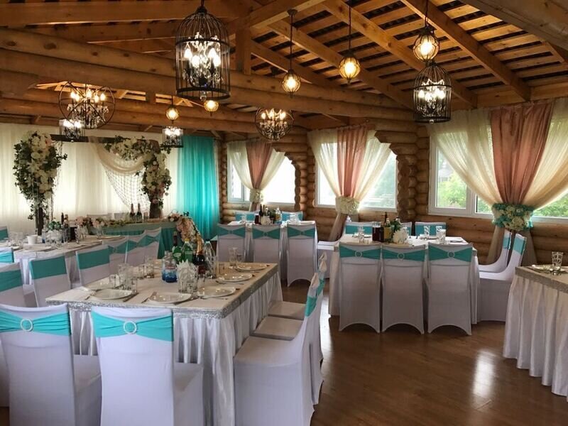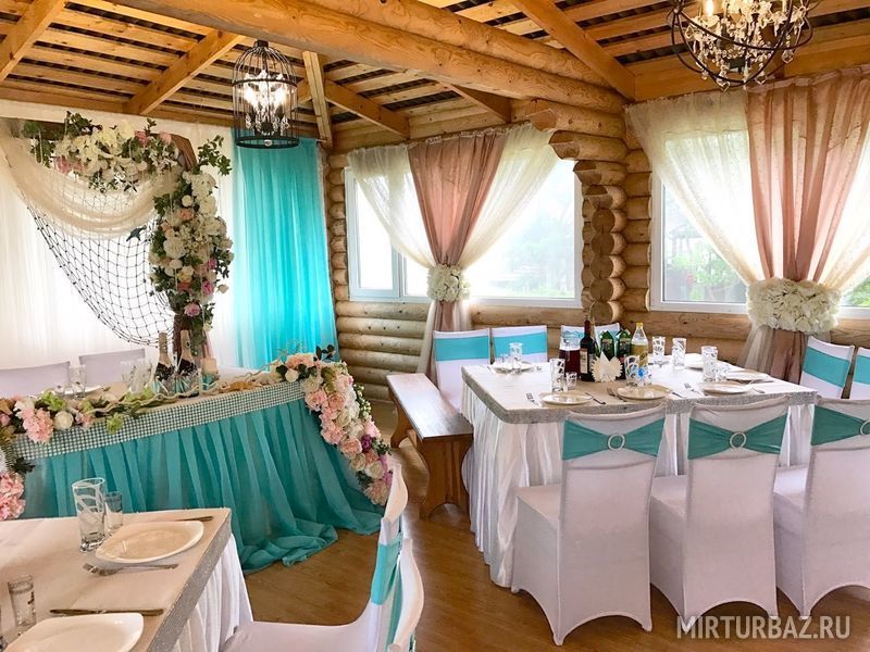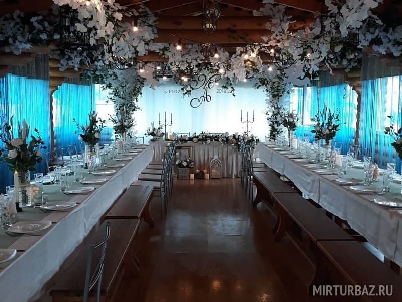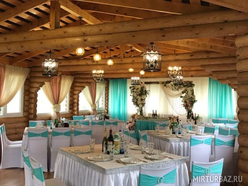 Вместимость зала до 72 человек. Банкетный зал оборудован мощной акустической системой, цветомузыкой. Есть столы и скамейки. Можно заказать блюда европейской и национальной восточной кухни.