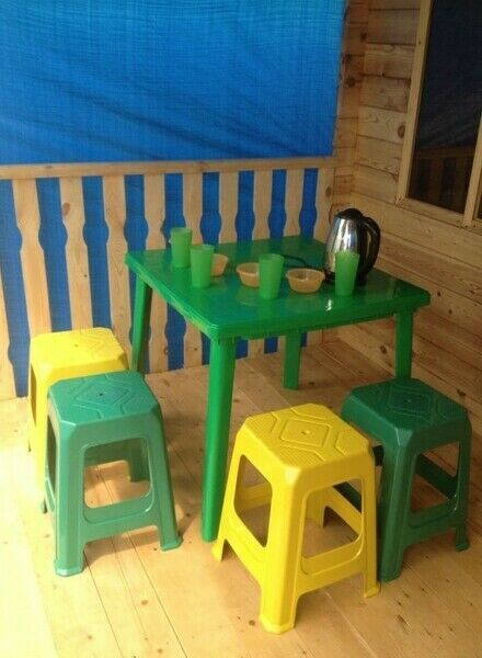 - Домики рассчитаны на 4 человека. Внутри имеются кровати с постельными принадлежностями и холодильник. На террасе располагается стол со стульями.