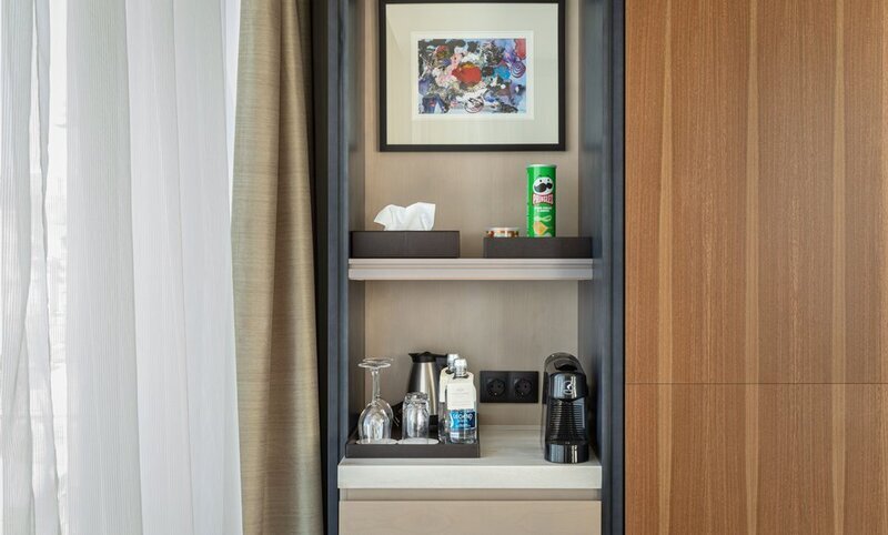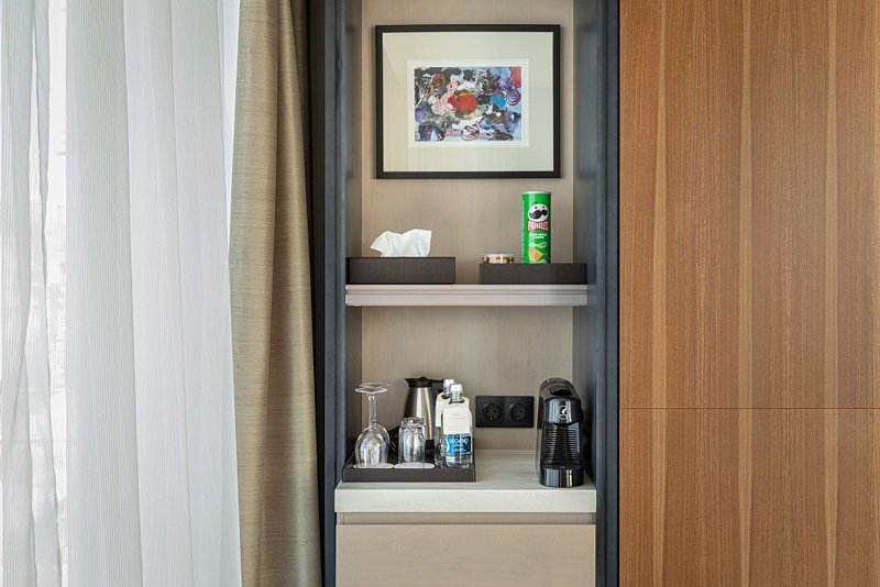 Минибар тоже заплнен с лоском -соки в стеклянных бутылочках вместо газировок в банках.