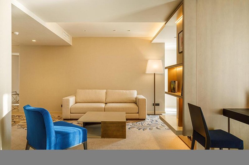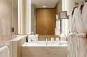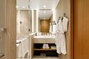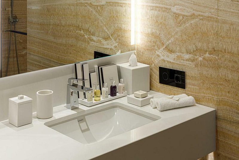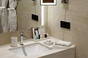 Номер Делюкс в видом на город. Ну как на город - море тоже видно. Номер восхитителен: просторная гостинная, достаточно большая спальня, чтобы в ней кроме кровати стоял стол с креслом, вместительная гардеробноя, в которой можно разложить гладильную доску, и она совсем не будет мешать. Два санузла - один это туалет в гостинной, второй, в спальне, включает в себя туалет, широченую умывальную столешницу с двумя раковинами и большущую душевую, в которой установлена изрядных размеров ванна. Пол в санузлах греется. Всё устроено предельно удобно. Отдельное спасибо за увеличивающее зеркало с подсветкой - не у всех женщин хорошее зрение, особенно с возрастом, а в очках не очень-то накрасишь.