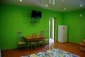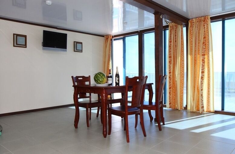 Оснащение: Номер состоит из 2-х комнат. 4-х местный номер со всеми удобствами и террасой с видом на море. 2-х спальная кровать, диван, телевизор, холодильник, кондиционер, м/в печь, чайник, стол, стулья, туалет, душ, умывальник (вода горячая, холодная).