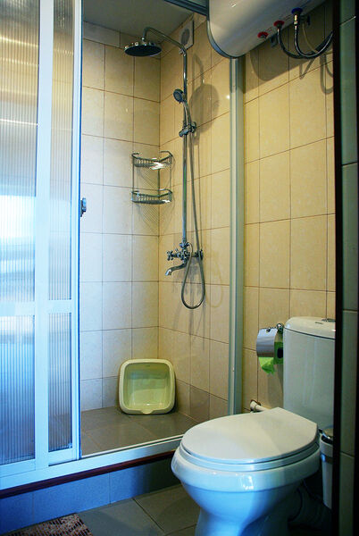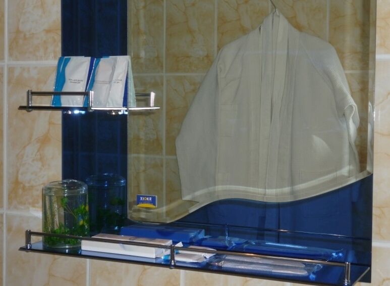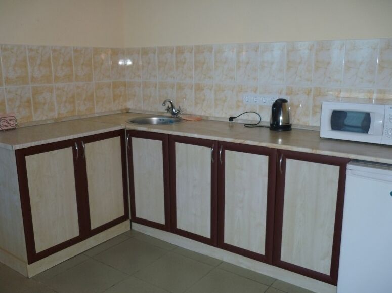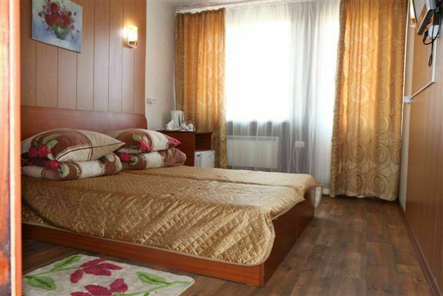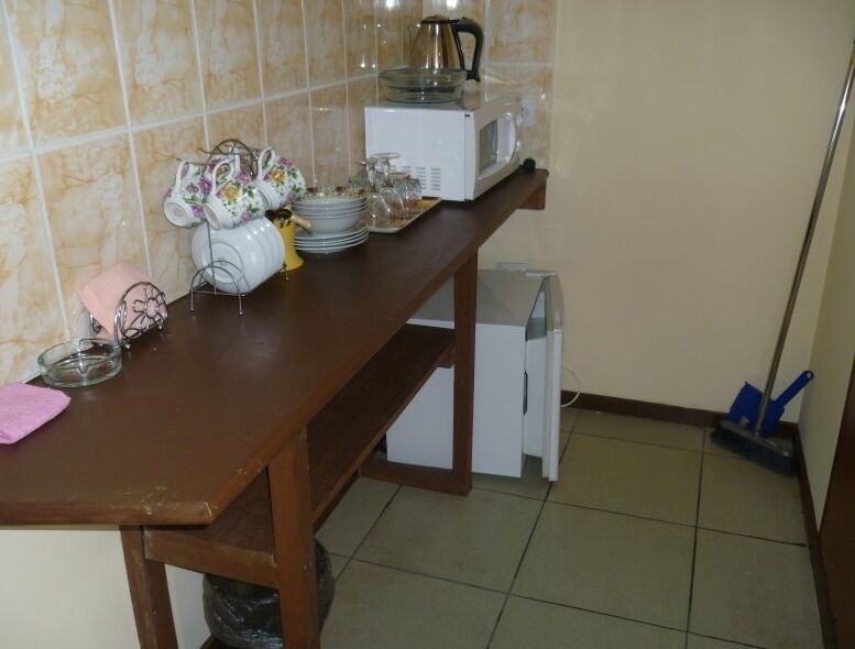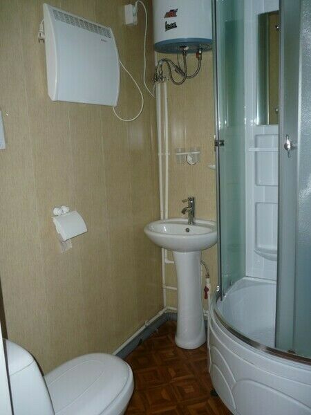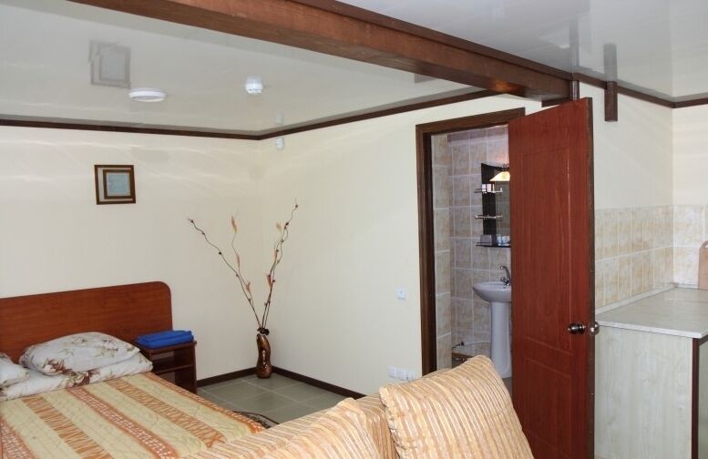 В номере: двуспальная кровать, стол, телевизор, холодильник, чайник, шкаф-купе, кухонный шкаф; туалет, душевая кабина, умывальник (вода горячая, холодная).