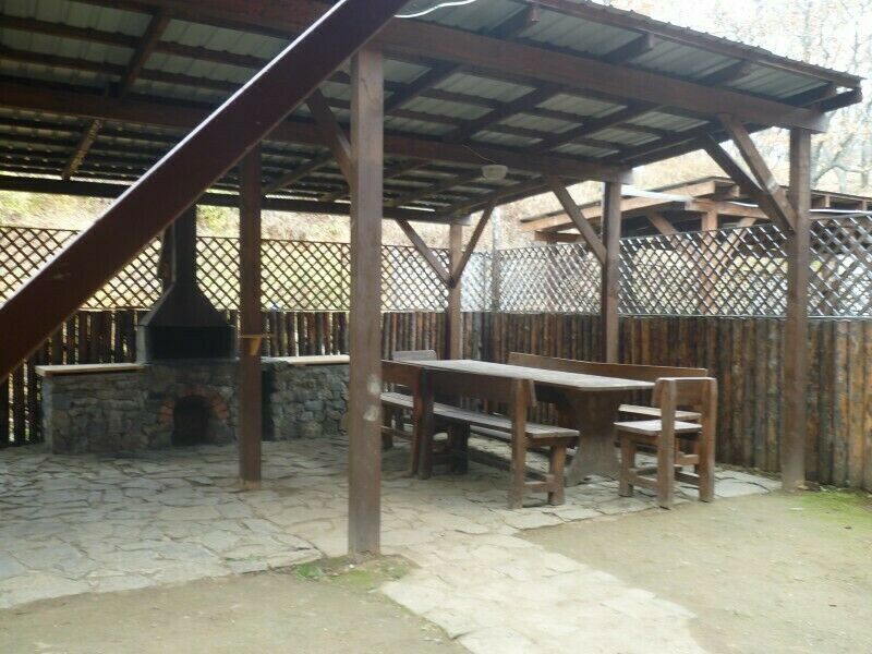 Перед входом в номер имеется небольшая зона отдыха под навесом, оборудованная столом и лавочками.