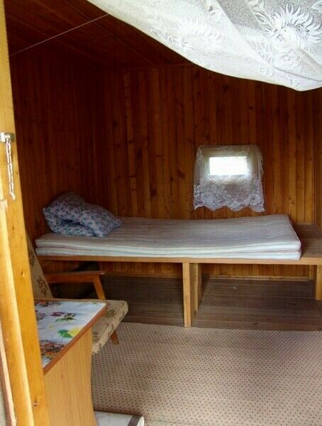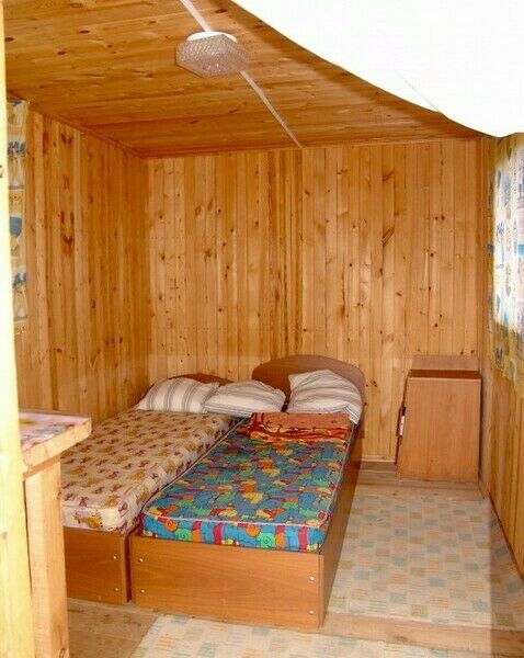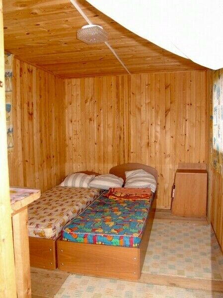 В каждом домике: односпальные кровати, чайник, посуда. У каждого домика есть открытая веранда, на которой имеется стол, лавочки.