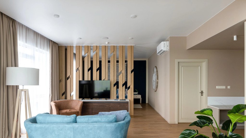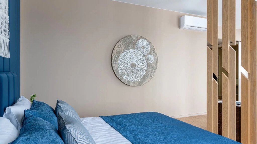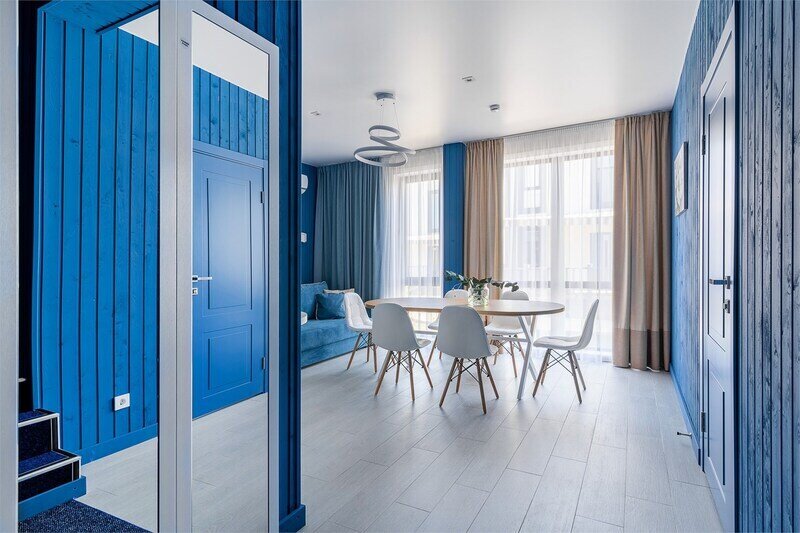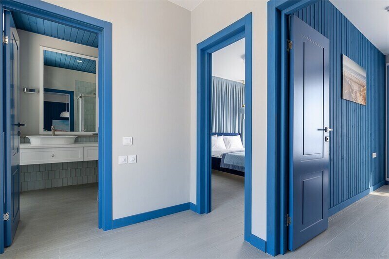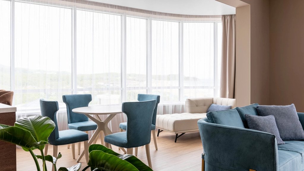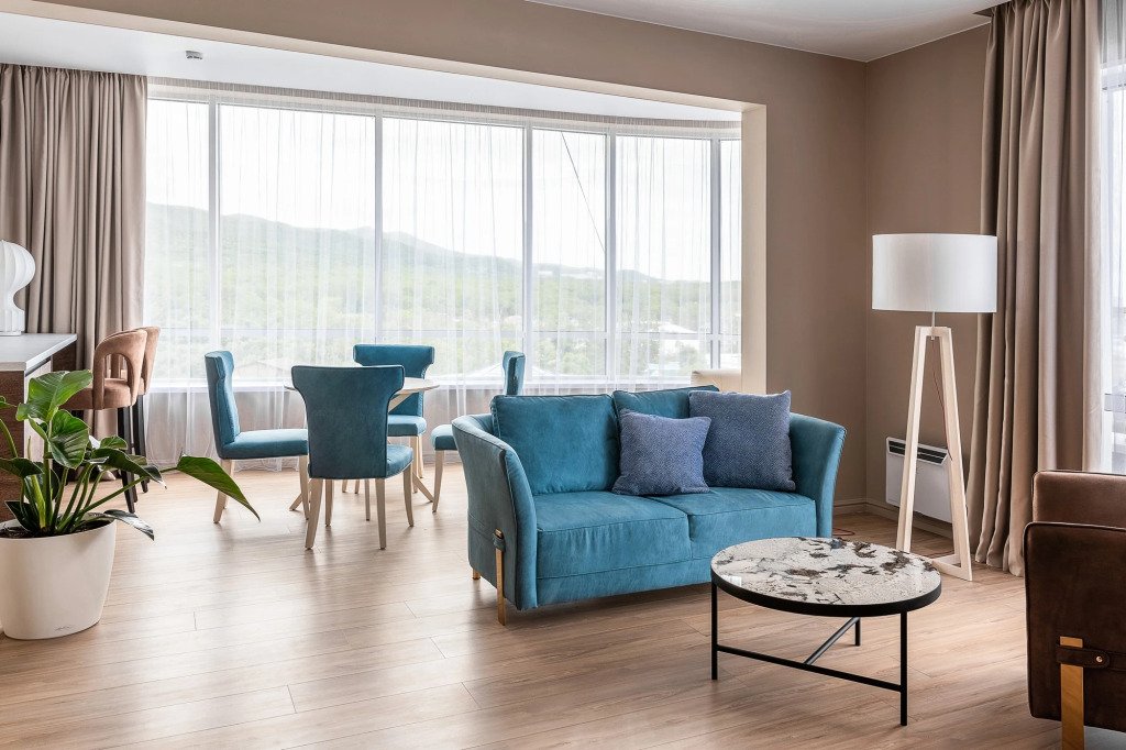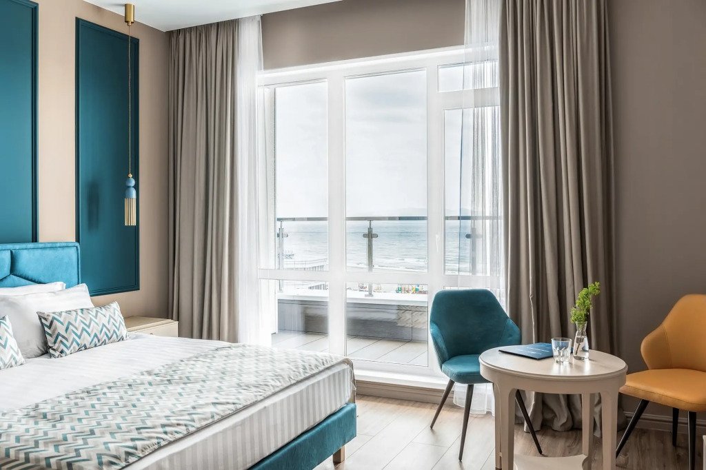 Номер повышенной комфортности оригинальной планировки площадью 65 м2 с огромными панорамными окнами с видом на море.