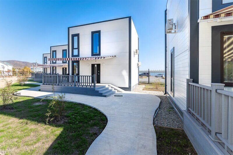 Современный, двухэтажный, 3-х комнатный коттедж с панорамными окнами, гостиной с кухонной зоной и просторной террасой. В шаговой доступности от моря.