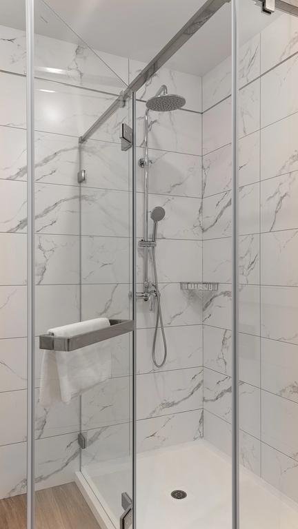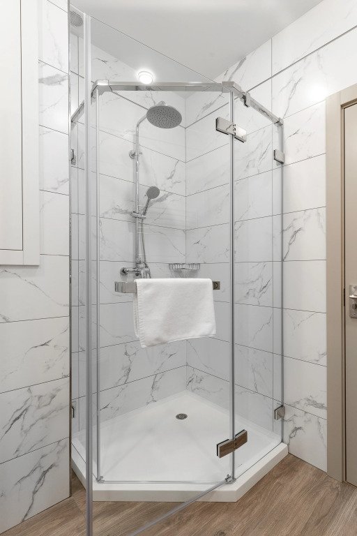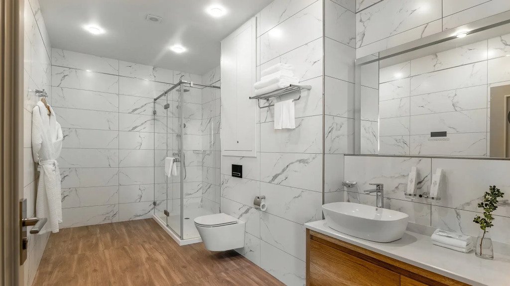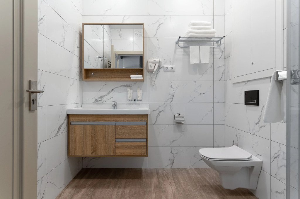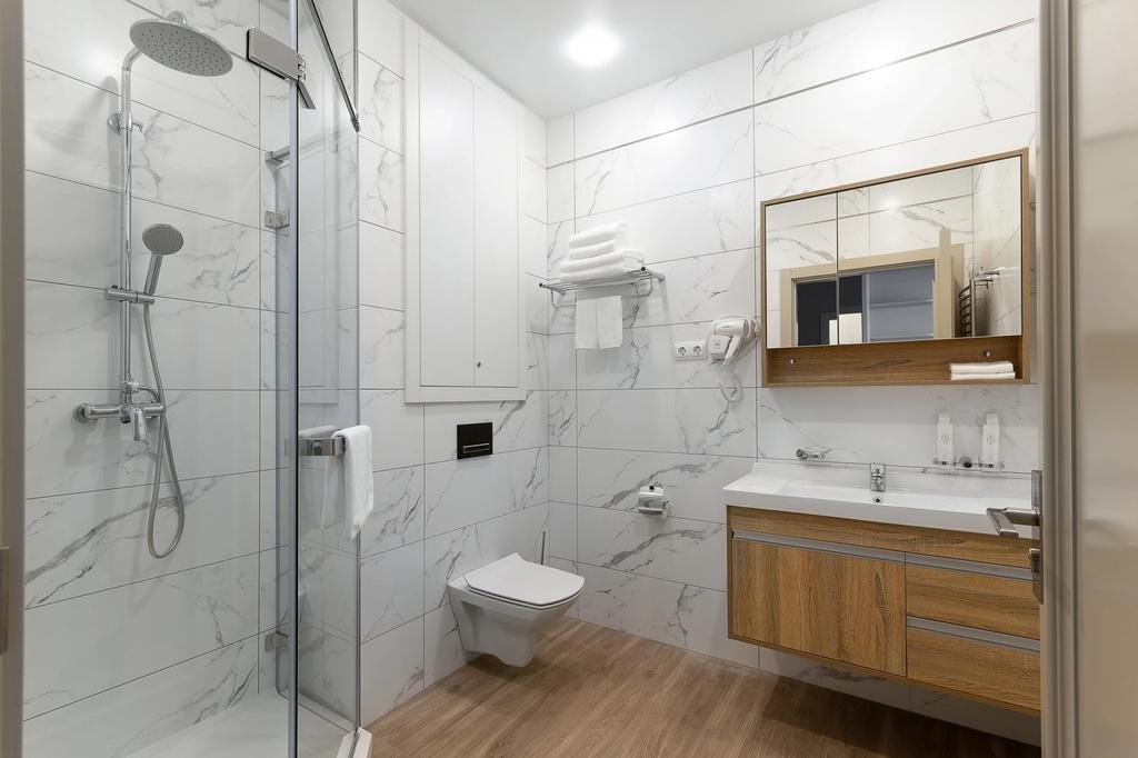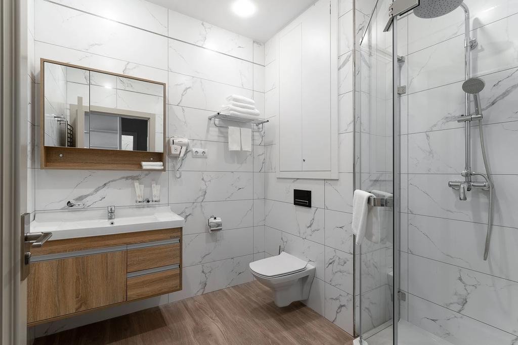 Номер общей площадью 28 кв.м. без балкона, с мини баром, с полным санузлом (умывальник, унитаз, душевая кабина)