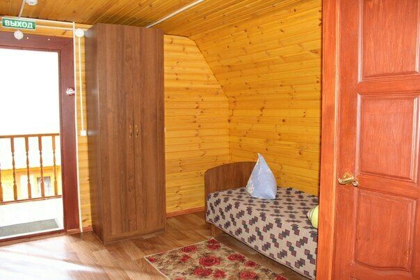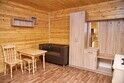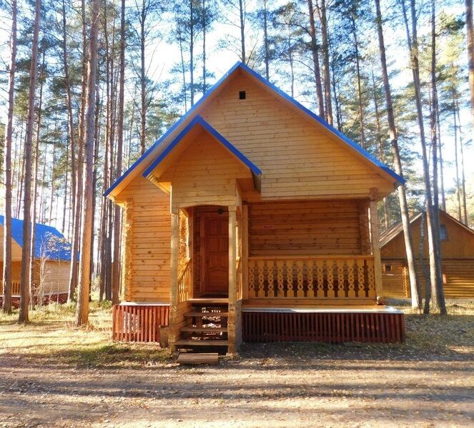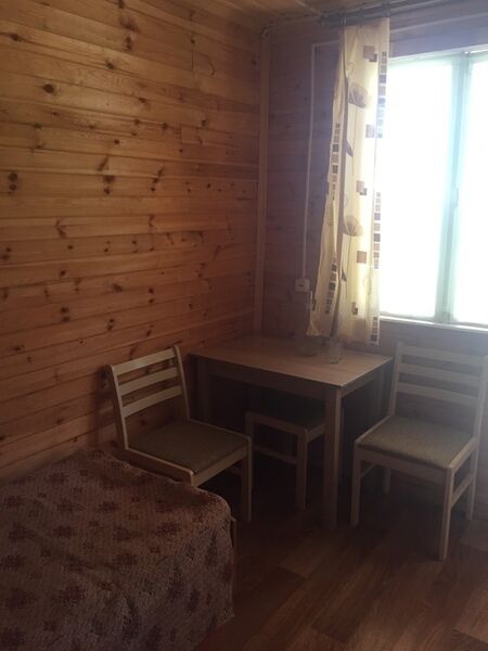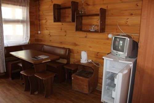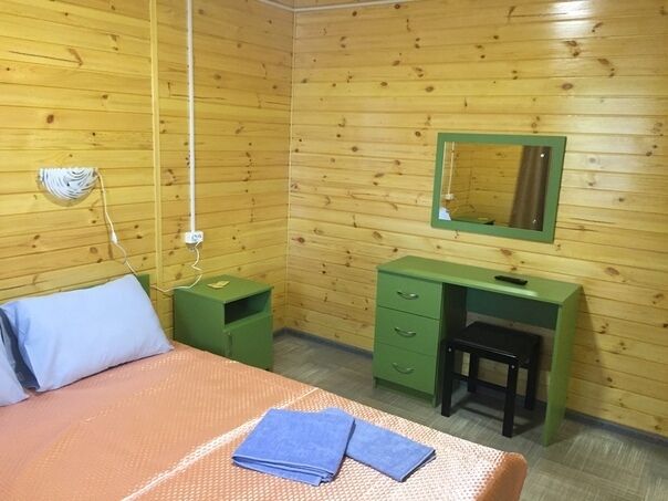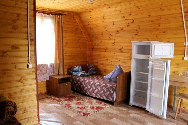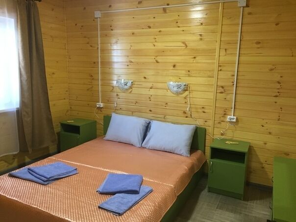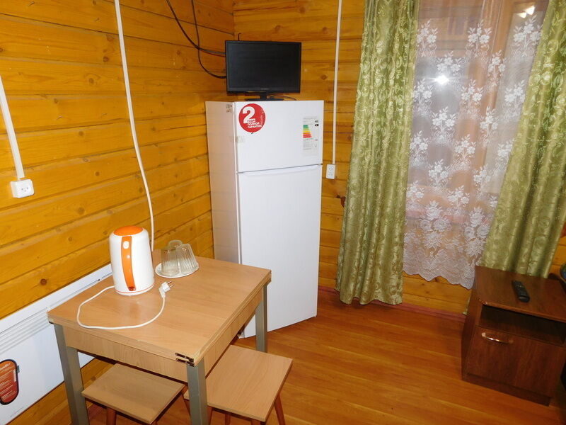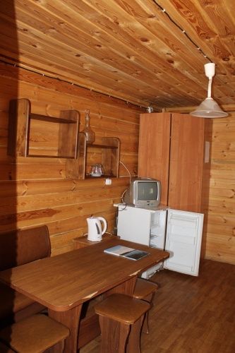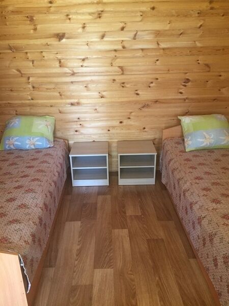 Рубленый деревянный двухэтажный коттедж (первый этаж). Работает круглый год. Позволяет с комфортом разместиться четырем взрослым. На первом этаже две комнаты по 2 места, комната отдыха, душ, туалет. В комнате отдыха холодильник и телевизор.