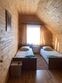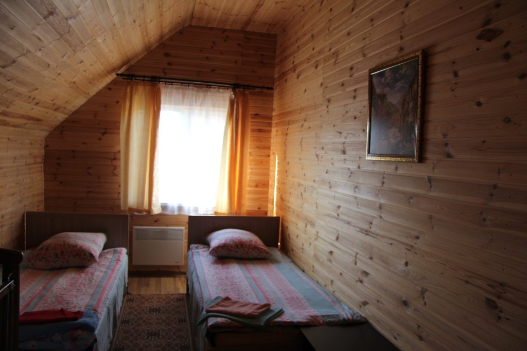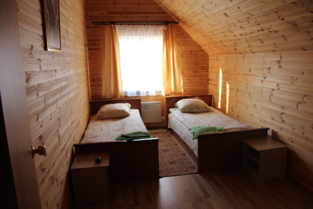 2 деревянных коттеджа. Спальня на втором этаже с односпальными кроватями,спальня на первом этаже -1,5 спальная кровать, в гостиной имеется раскладной диван, стол, холодильник, телевизор. Душ, туалет в коттедже.