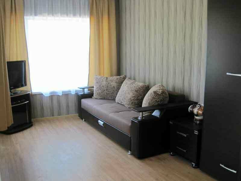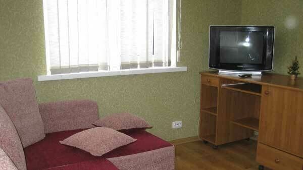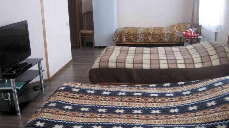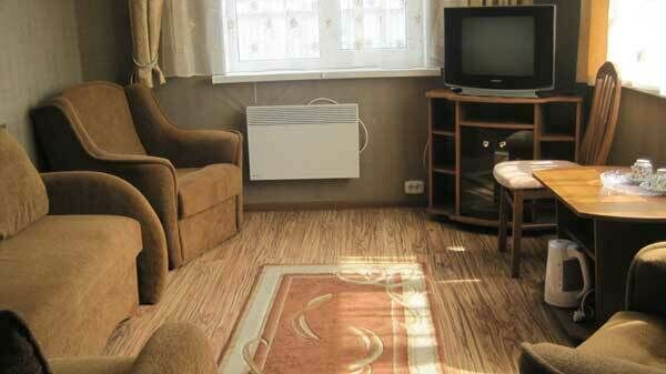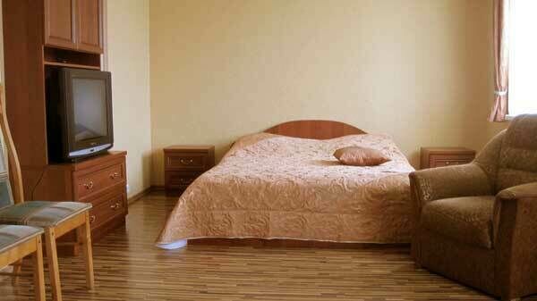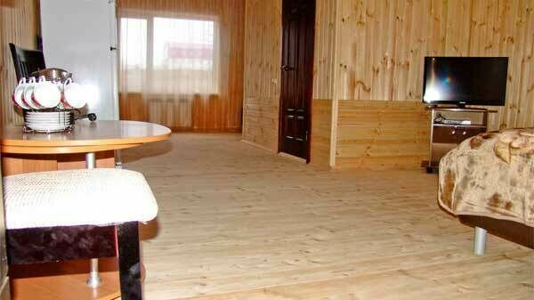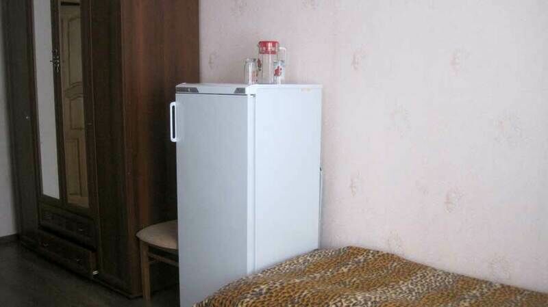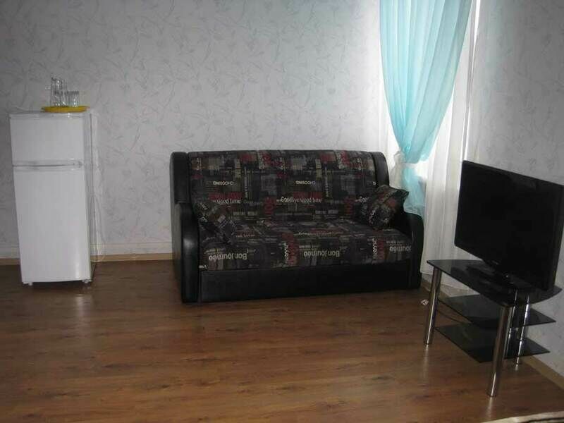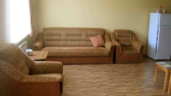 Небольшая уютная комната с раскладным диваном. Телевизор, холодильник. В каждом из номеров есть чайный сервиз и электрочайник.