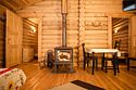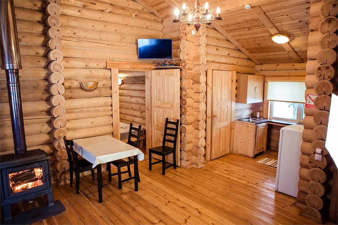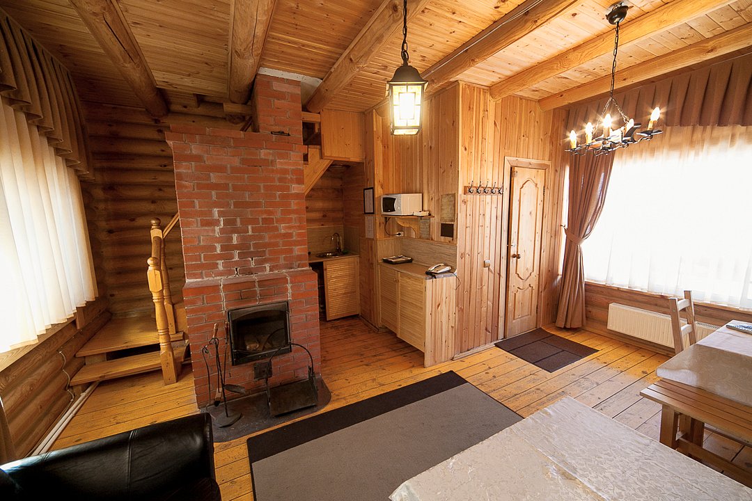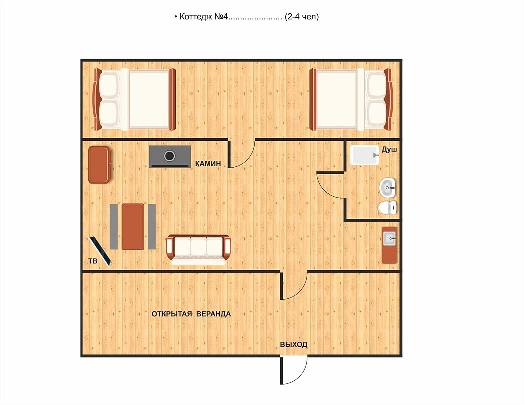 Коттедж на 2-4 человека Деревянный коттедж, общей площадью 25 кв.м., расположенный на первой линии, подойдет для комфортного проживания семьи с детьми. В коттедже расположены гостиная с удобным диваном, обеденным столом и камином, кухонная зона, спальня с двумя двуспальными кроватями, сан. узел, терраса с уличной мебелью. Мангальная зона у каждого коттеджа. В коттедже автономная система отопления.Услуги и удобства