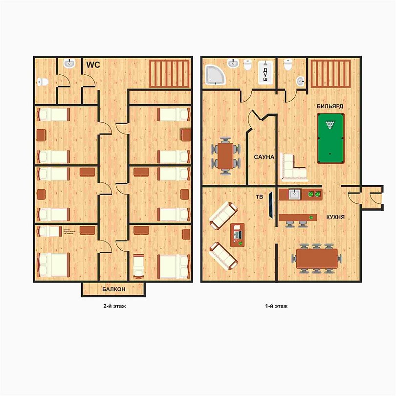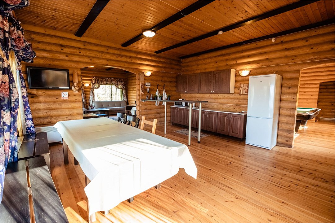 Деревянный двухэтажный коттедж, общей площадью 310 кв.м., идеально подойдет для комфортного проживания семьи, привыкшей получать отдых высшего качества, а также для веселых компаний собравшихся устроить вечеринку. В коттедже на 1 этаже расположена оборудованная кухня с барной стойкой и столом , зал с удобными разбирающимися диванами с большим ЖК телевизором и магнитолой, бильярдная с немецким пулом, финская сауна (5 часа в день) с джакузи, два сан. узла. На 2 этаже расположены 6 спален: 2 большие спальни с двуспальными кроватями с красивым видом на озеро, 4 спальни с односпальными кроватями, сан. узел, балкон над озером. В коттедже автономная система отопления и собственная система фильтрации воды. В стоимость аренды входит деревянная беседка, мангал.Услуги и удобства